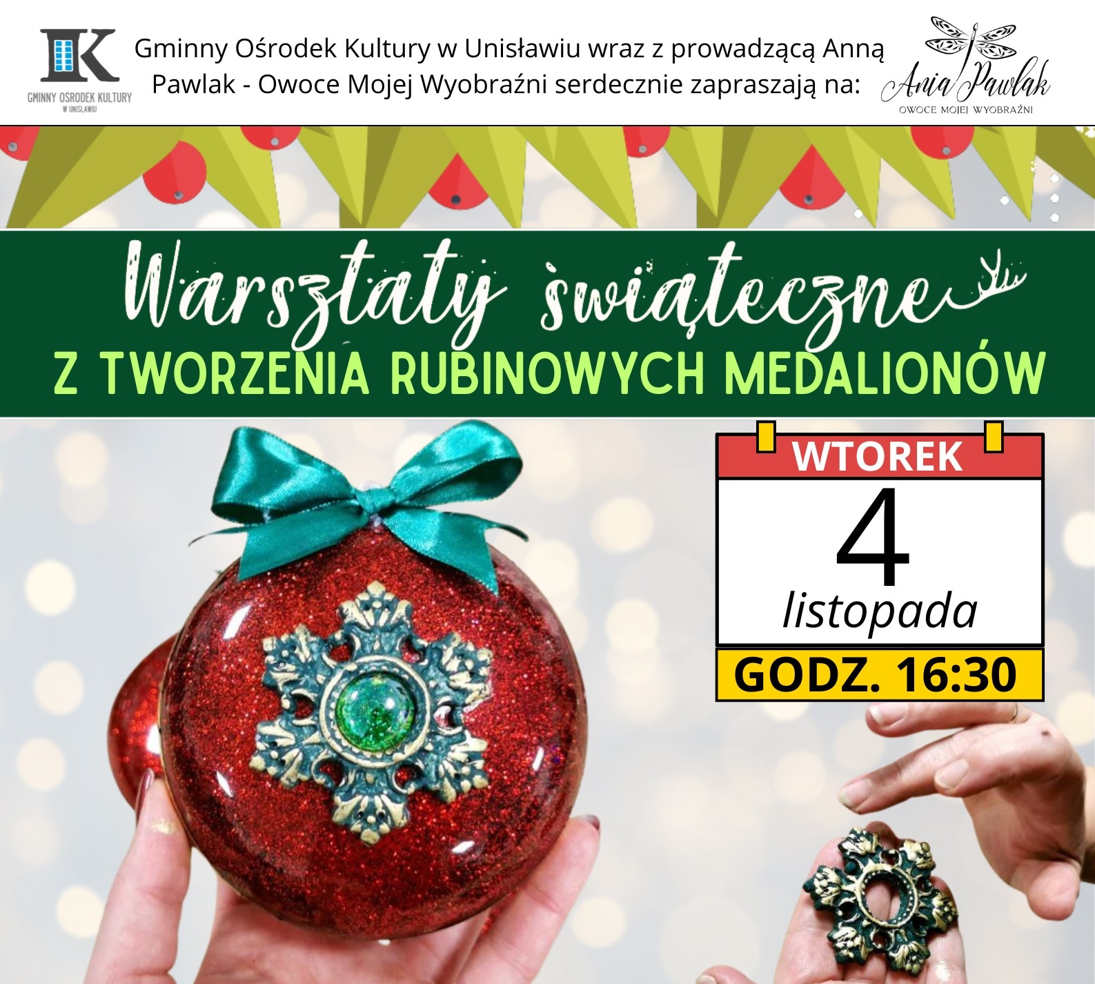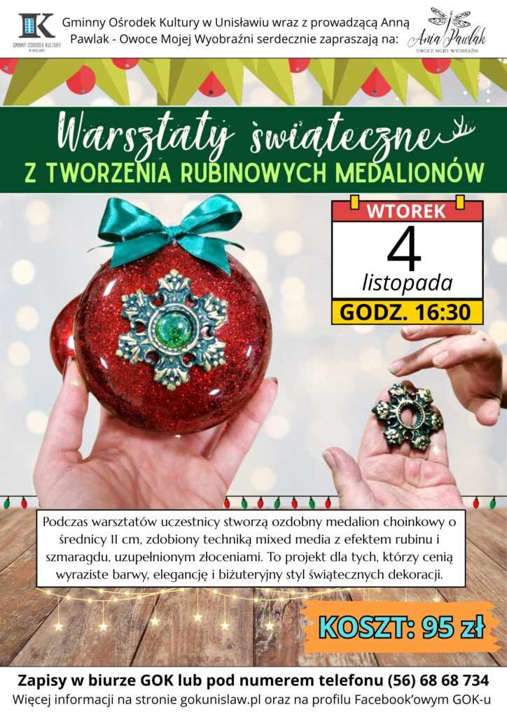 Gminny Ośrodek Kultury w Unisławiu wraz z prowadzącą Owoce Mojej Wyobraźni – Ania Pawlak, serdecznie zapraszają dorosłych na świąteczne warsztaty tworzenia rubinowych medalionów. Kreatywne spotkanie odbędzie się we wtorek, 4 listopada o godz. 16:30. Koszt udziału wynosi 95 zł.