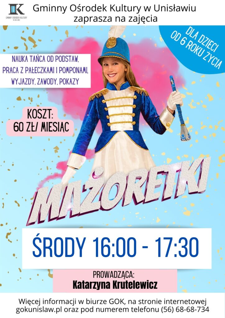 Gminny Ośrodek Kultury w Unisławiu wraz z prowadzącą Katarzyną Krutelewicz serdecznie zapraszają dzieci powyżej 6 roku życia do udziału w zajęciach mażoretek. Spotkania będą odbywały się cyklicznie w środy w godz. 16:00 – 17:30, a pierwsze z nich już 8 października. Koszt udziału wynosi 60 zł/miesiąc.