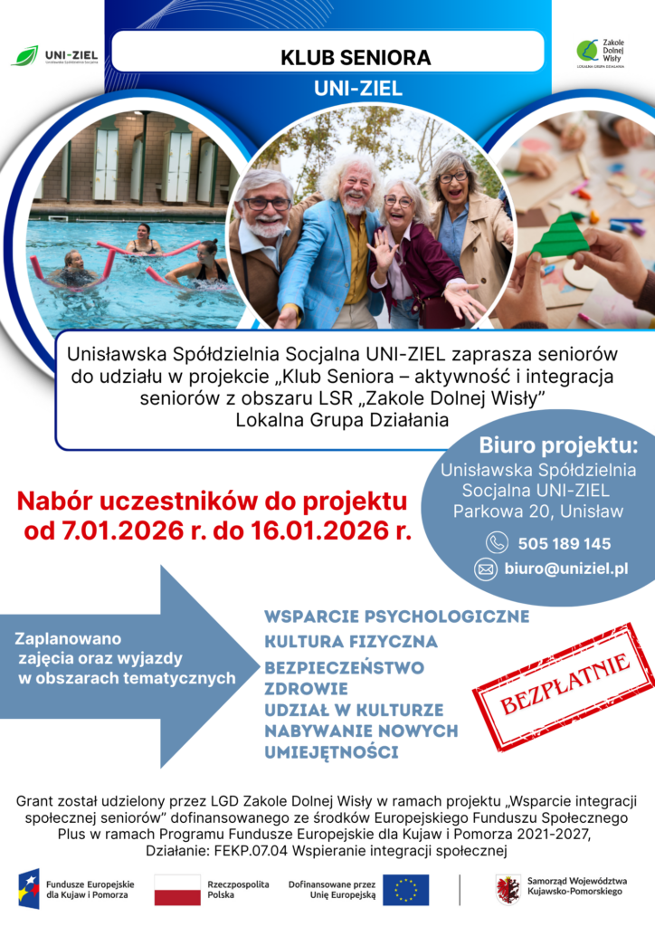 Unisławska Spółdzielnia Socjalna UNI-ZIEL zaprasza seniorów do udziału w projekcie „Klub Seniora – aktywność i integracja seniorów z obszaru LSR „Zakole Dolnej Wisły” Lokalna Grupa Działania.