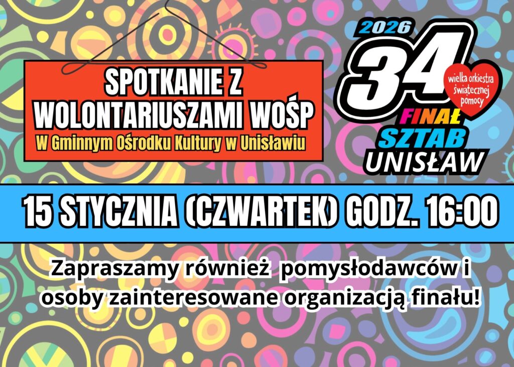 Unisławski sztab WOŚP, który mieści się w Gminnym Ośrodku Kultury w Unisławiu, serdecznie zaprasza na spotkanie z wolontariuszami, pomysłodawcami oraz osobami zainteresowanymi organizacją finału, które odbędzie się 15 stycznia (czwartek) o godz. 16:00 w GOK-u.