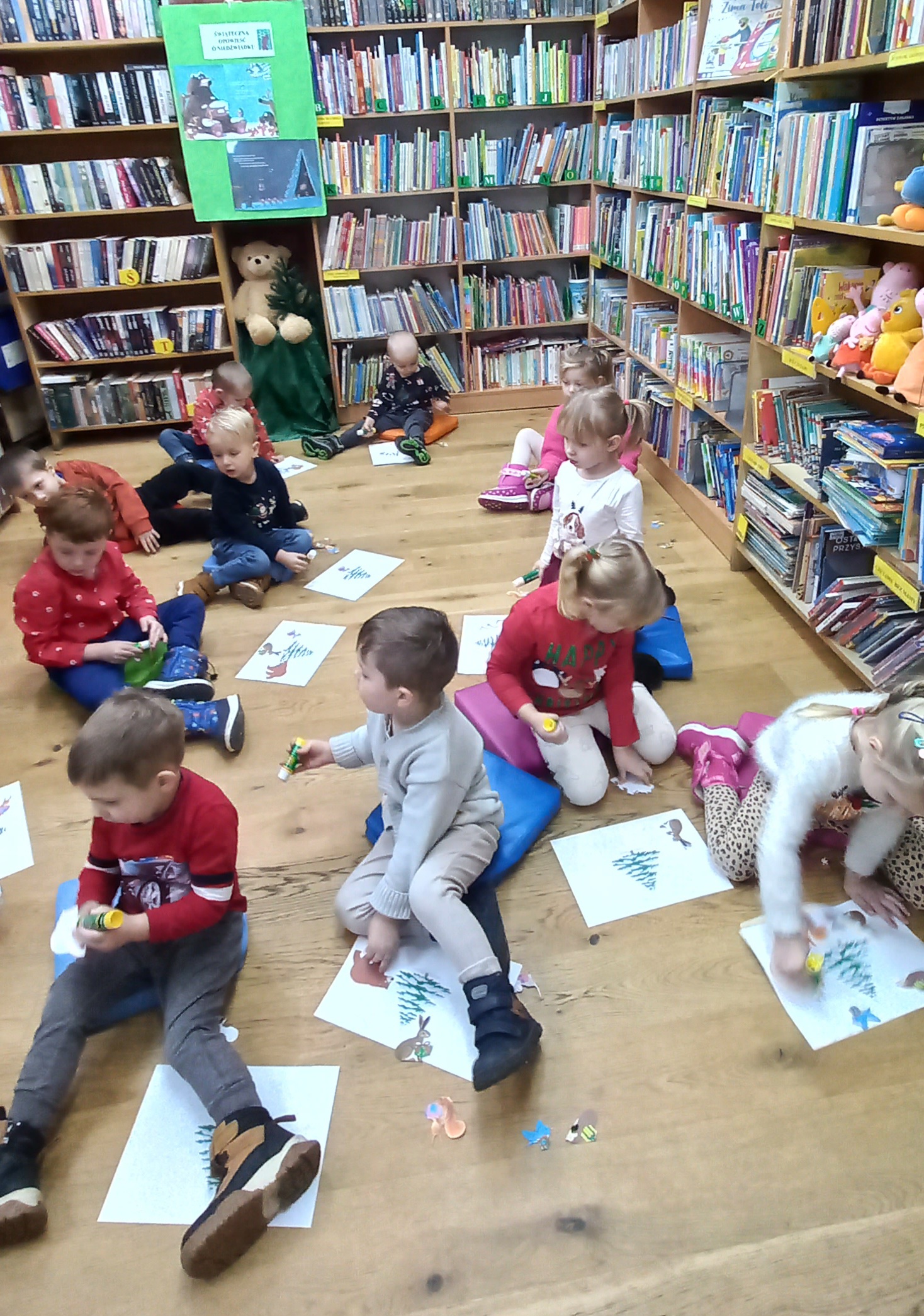 Dzieci wysłuchały opowieści o małym niedźwiadku, który przygotowuje się do Wigilii. Po lekturze odbyła się rozmowa o tym, jak można okazywać dobro i życzliwość innym nie tyko w święta. Na zakończenie zajęć maluchy wykonały prace plastyczne inspirowane przygodami niedźwiadka.