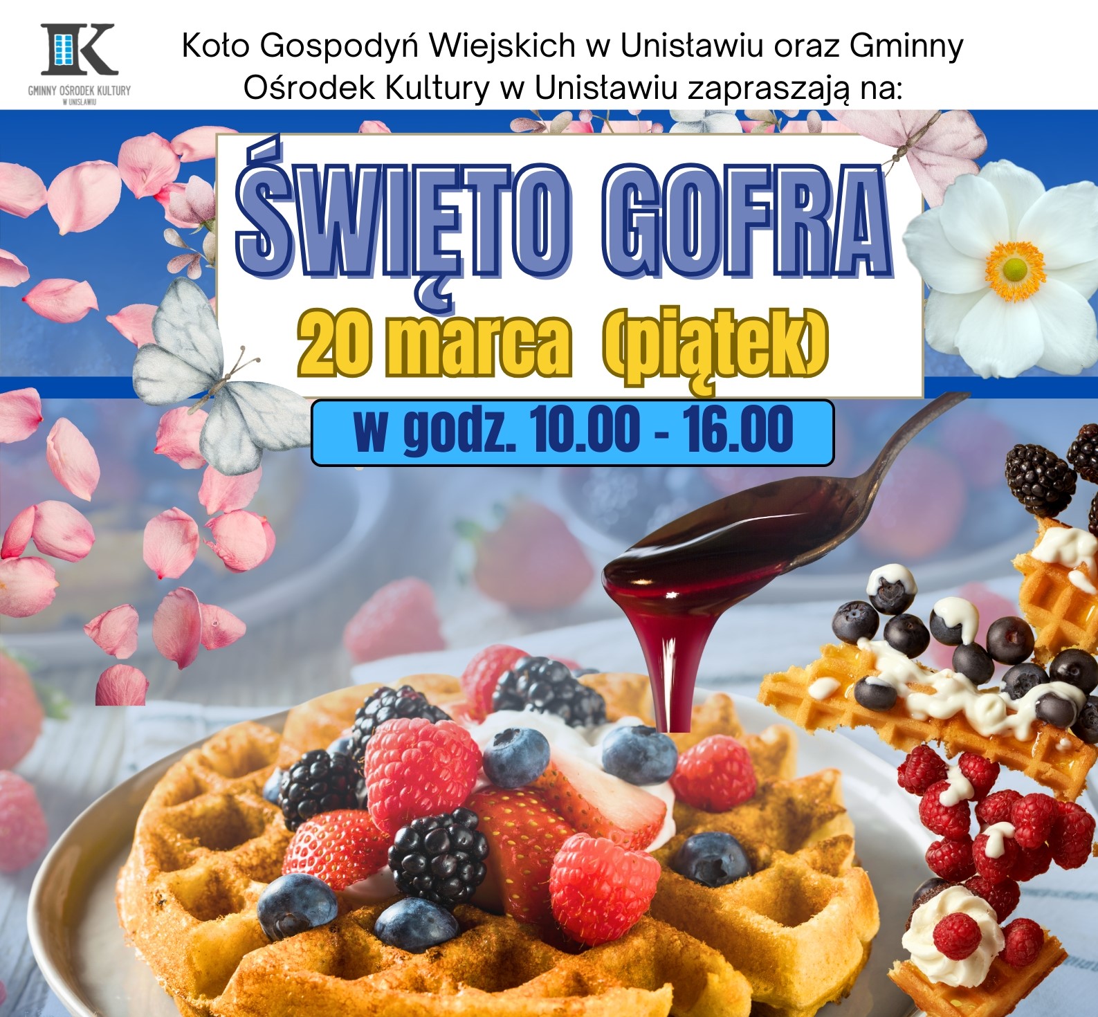 Koło Gospodyń Wiejskich w Unisławiu oraz Gminny Ośrodek Kultury w Unisławiu zapraszają na obchody Święta Gofra. Gofry z cukrem pudrem lub dżemem będą sprzedawane w kuchni sołeckiej (piwnica GOK) od strony parku w godzinach 10:00 – 16:00 w cenie 5 zł za sztukę.