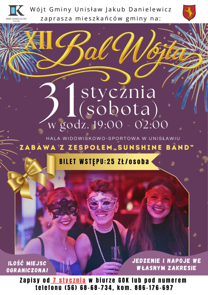 Wójt Jakub Danielewicz zaprasza pełnoletnich mieszkańców gminy Unisław na XII Bal Wójta, który odbędzie się 31 stycznia (sobota). Impreza rozpocznie się o godz. 19:00 i potrwa do godz. 2:00 w nocy. Uczestnicy będą bawili się w hali widowiskowo-sportowej, przy muzycznej oprawie zespołu SunShine Band. Bilet wstępu wynosi 25 zł od osoby. Jedzenie oraz napoje we własnym zakresie.