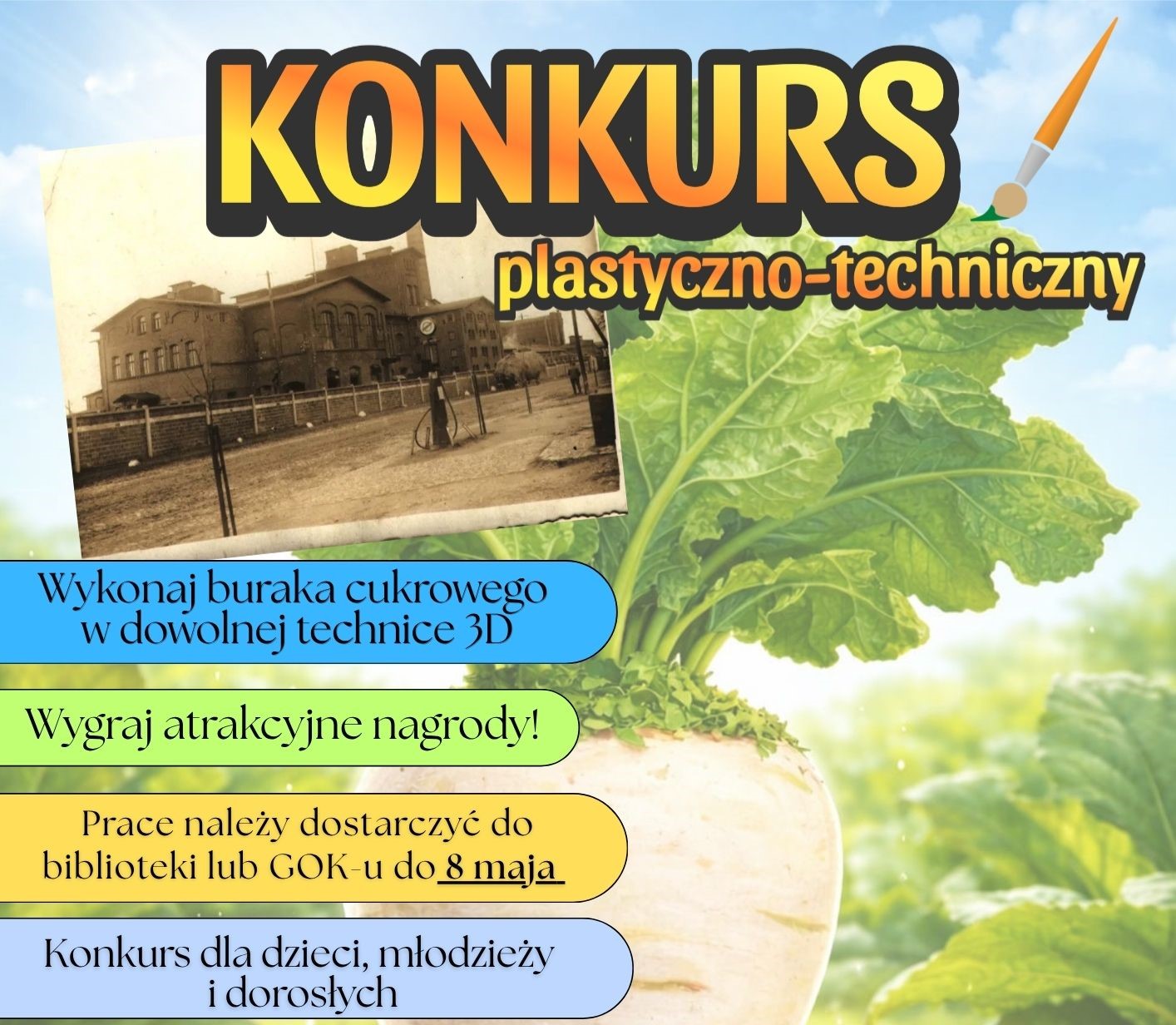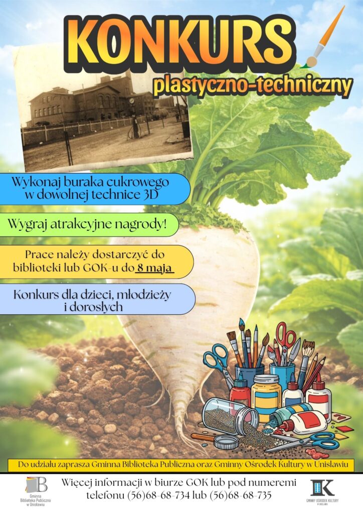 Gminna Biblioteka Publiczna wraz z Gminnym Ośrodkiem Kultury w Unisławiu serdecznie zapraszają zarówno dzieci, młodzież i dorosłych do udziału w konkursie plastyczno-technicznym. Zadanie polega na stworzeniu buraka cukrowego w formie przestrzennej. Metoda jest dowolna, liczy się kreatywność.