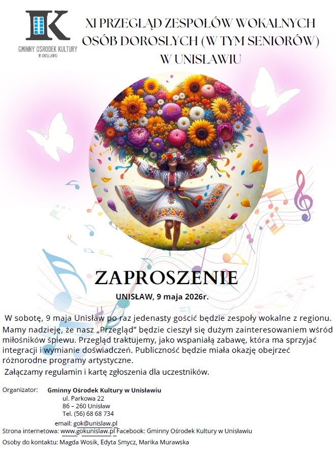 Szczegółowe informacje dotyczące zgłoszeń oraz regulamin przeglądu dostępne w Gminnym Ośrodku Kultury w Unisławiu, tel. 56 6868734, mail: gok@unislaw.pl