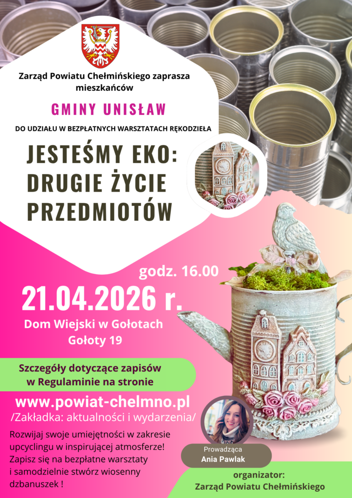 Zarząd Powiatu Chełmińskiego zaprasza mieszkańców Gminy Unisław do udziału w bezpłatnych warsztatach rękodzieła.