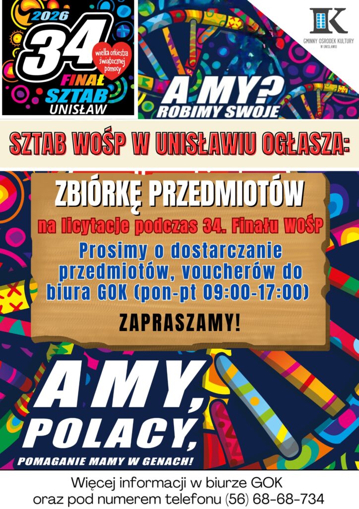 To już ten moment, to już ta chwila. 34. Finał Wielkiej Orkiestry Świątecznej Pomocy wielkimi krokami przybywa. Unisławski GOK zaprasza do udziału w zbiórce przedmiotów oraz różnorodnych voucherów, gadżetów, które zostaną przeznaczone na licytacje WOŚP. Można je dostarczać do biura GOK od poniedziałku do piątku w godzinach 09:00-17:00.